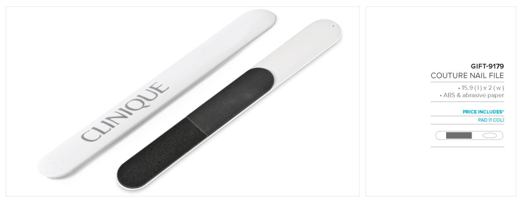 Plastic file with abrasive paper on one side. Full branding area at top to