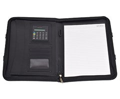 Ziparound Folder with Magnetic Drop Handle. Includes a calculator, pen holder,