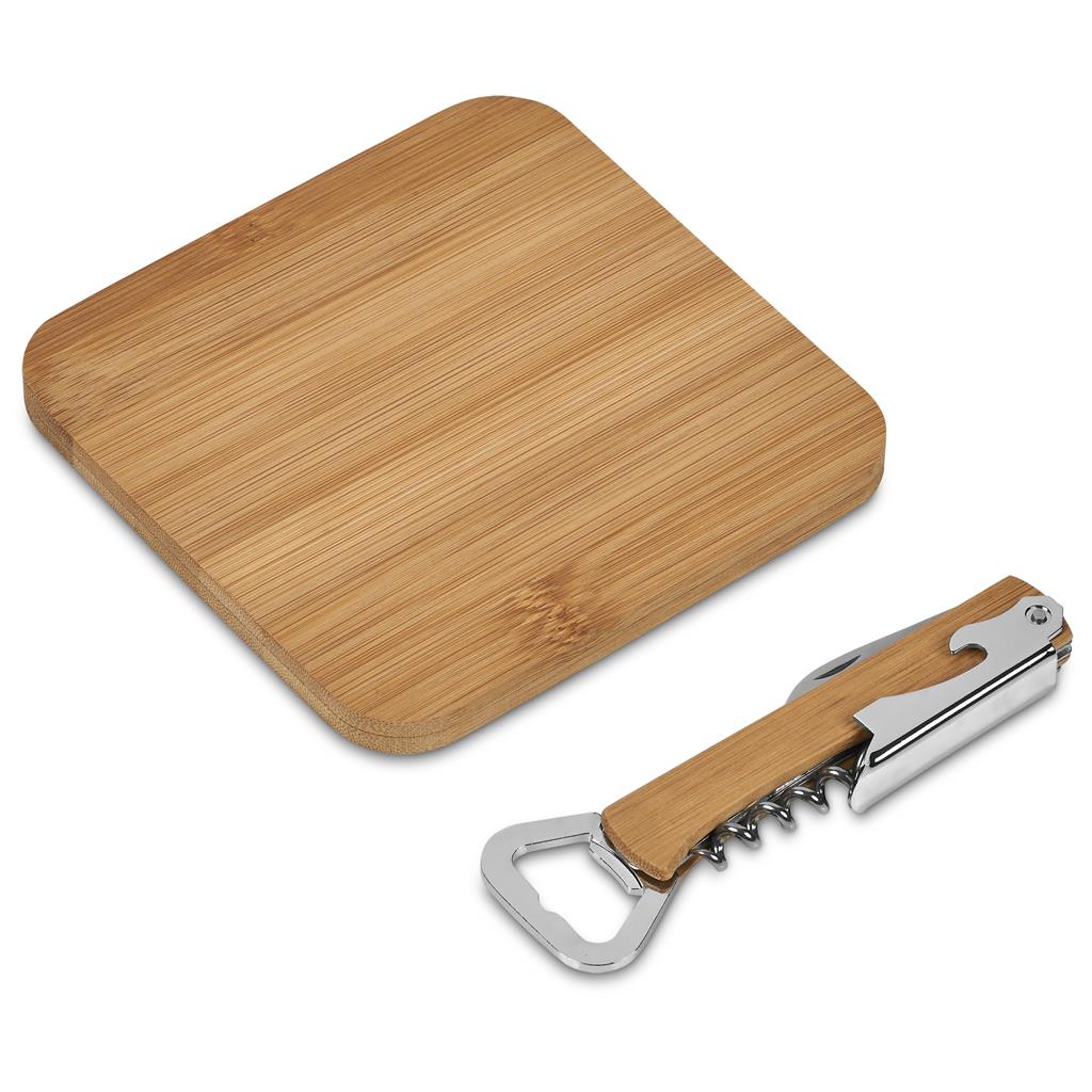 small bamboo cutting board, and a tool featuring a corkscrew, a bottle opener